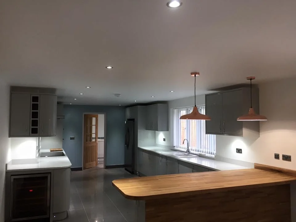 This is an example of a kitchen retire we did at a clients house in Losonford, We work with them all the way through to make sure the job runs smoothly and all the requirements are met. In this job they went for a mix of lighting styles with under cupboard & plinth, downlights and pendants over the island and lounge area supplied by GBS lighting (Hockley Heath). We also installed the TV recessed into the fire place.
